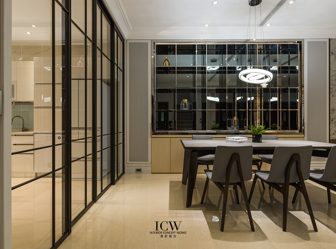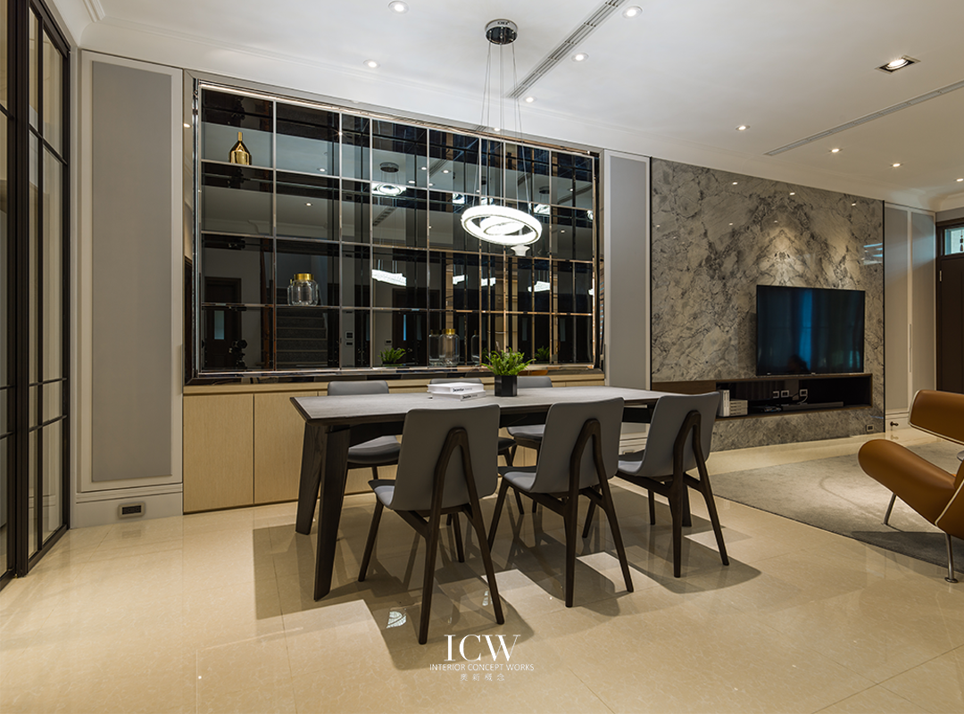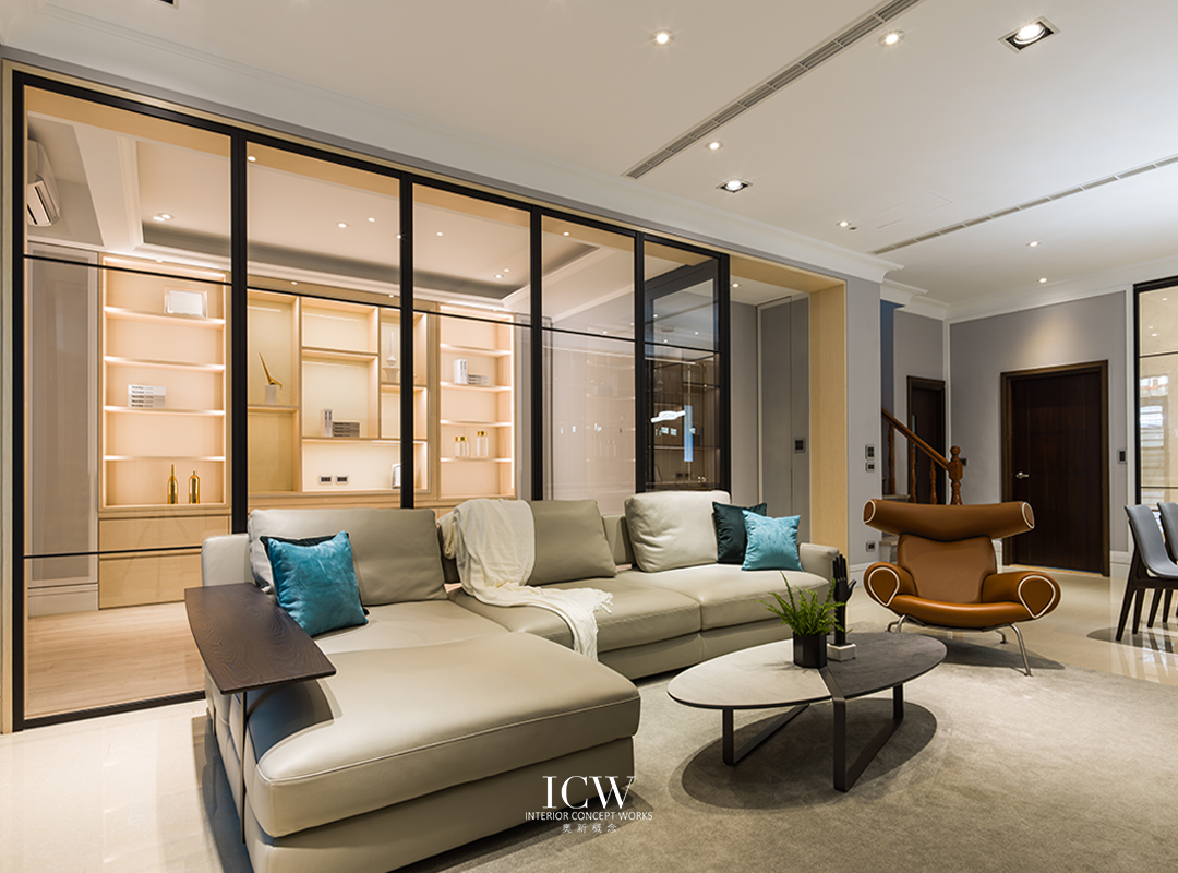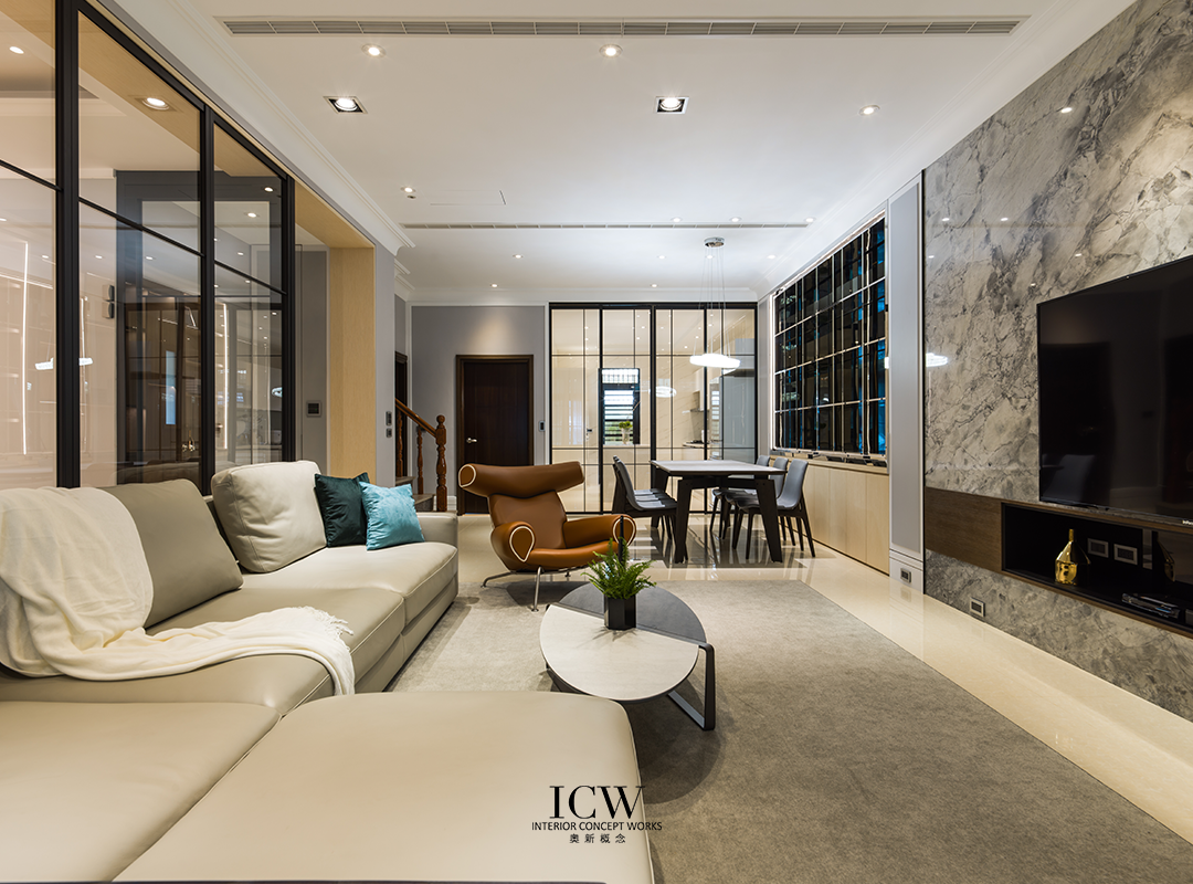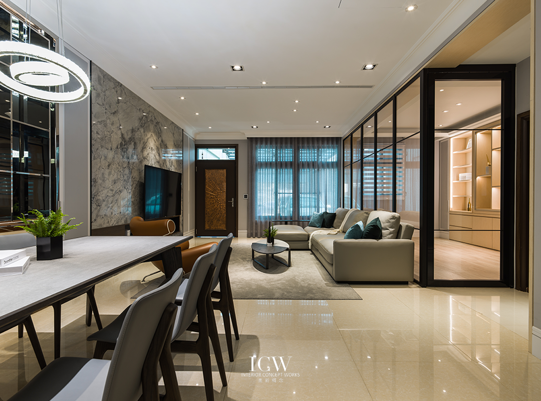 設計的核心是令人印象深刻的灰色意大利大理石電視牆,不僅是視覺焦點,還為整個空間增加優雅氣息。 在餐廳區域,一個長達6米的定制鏡面開放金屬展示櫃成為亮點。這個設計元素不僅具有實用價值,還能反射光線,增加了視覺空間感,為用餐體驗增添了豪華感。 客廳與書房之間巧妙運用了玻璃隔斷,既保證了空間的流動性,又清晰地界定了不同區域的功能。透明玻璃設計不僅增強了開放感,還讓整個空間更加明亮通透。 書房的亮點是一個定制的木質展示書架,搭配了精心設計的照明系統。這不僅為書和藝術品提供了完美的展示空間,還為整個區域增添了溫暖和個性化的氛圍。 這種精心挑選的材料和巧妙的設計元素完美結合,營造出一個精緻而富有吸引力的家居環境。每一個細節都經過深思熟慮,呈現室內設計藝術。