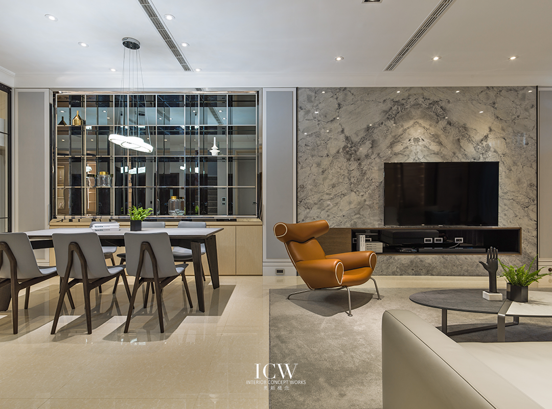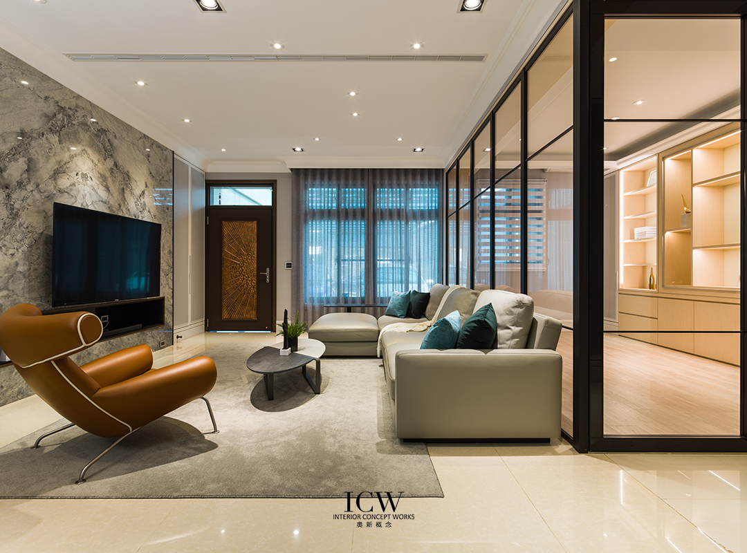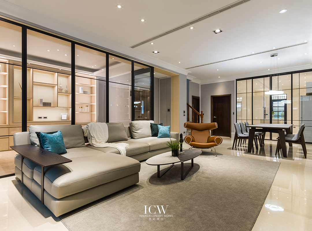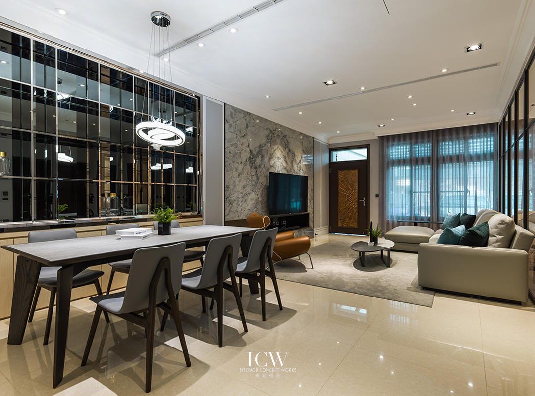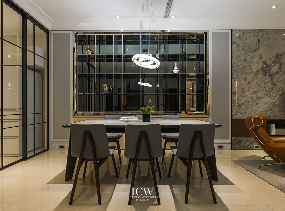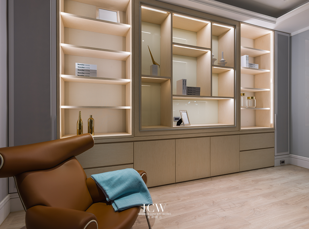 設計的核心是令人印象深刻的灰色意大利大理石電視牆,不僅是視覺焦點,還為整個空間增加優雅氣息。 在餐廳區域,一個長達6米的定制鏡面開放金屬展示櫃成為亮點。這個設計元素不僅具有實用價值,還能反射光線,增加了視覺空間感,為用餐體驗增添了豪華感。 客廳與書房之間巧妙運用了玻璃隔斷,既保證了空間的流動性,又清晰地界定了不同區域的功能。透明玻璃設計不僅增強了開放感,還讓整個空間更加明亮通透。 書房的亮點是一個定制的木質展示書架,搭配了精心設計的照明系統。這不僅為書和藝術品提供了完美的展示空間,還為整個區域增添了溫暖和個性化的氛圍。 這種精心挑選的材料和巧妙的設計元素完美結合,營造出一個精緻而富有吸引力的家居環境。每一個細節都經過深思熟慮,呈現室內設計藝術。