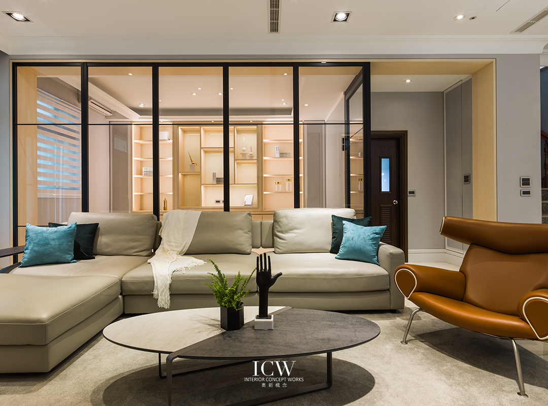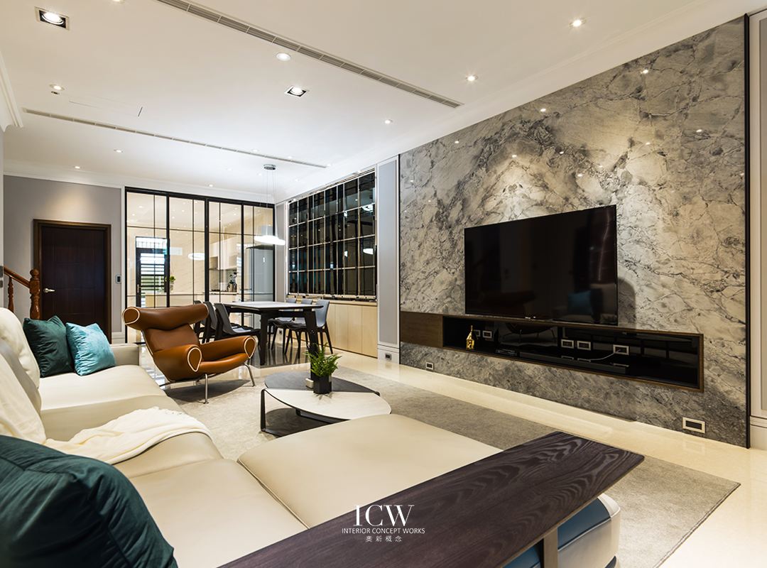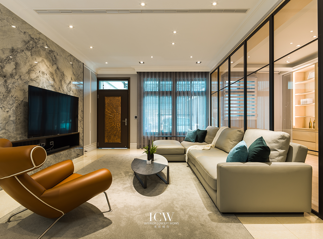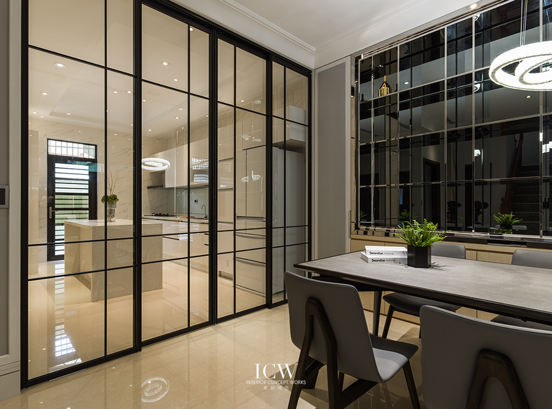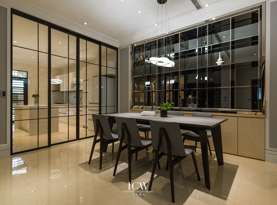 設計的核心是令人印象深刻的灰色意大利大理石電視牆,不僅是視覺焦點,還為整個空間增加優雅氣息。 在餐廳區域,一個長達6米的定制鏡面開放金屬展示櫃成為亮點。這個設計元素不僅具有實用價值,還能反射光線,增加了視覺空間感,為用餐體驗增添了豪華感。 客廳與書房之間巧妙運用了玻璃隔斷,既保證了空間的流動性,又清晰地界定了不同區域的功能。透明玻璃設計不僅增強了開放感,還讓整個空間更加明亮通透。 書房的亮點是一個定制的木質展示書架,搭配了精心設計的照明系統。這不僅為書和藝術品提供了完美的展示空間,還為整個區域增添了溫暖和個性化的氛圍。 這種精心挑選的材料和巧妙的設計元素完美結合,營造出一個精緻而富有吸引力的家居環境。每一個細節都經過深思熟慮,呈現室內設計藝術。