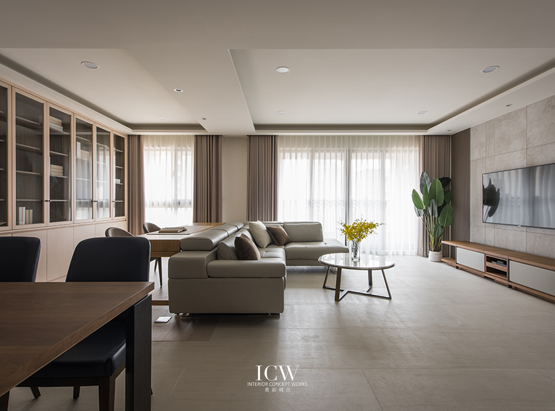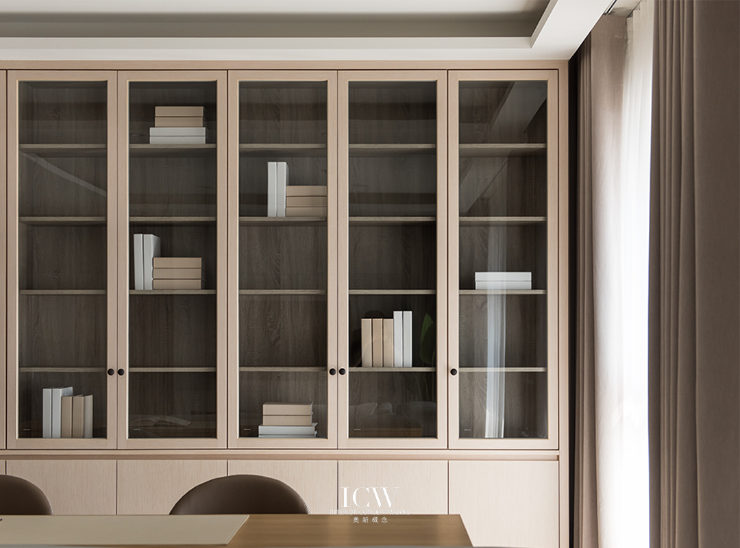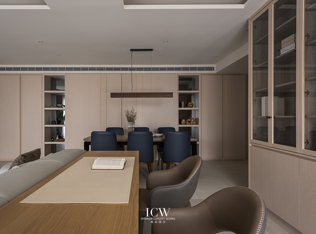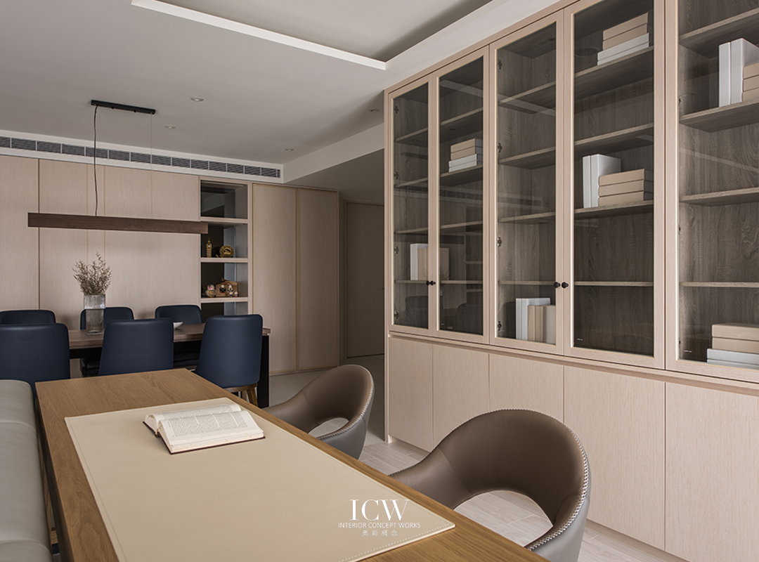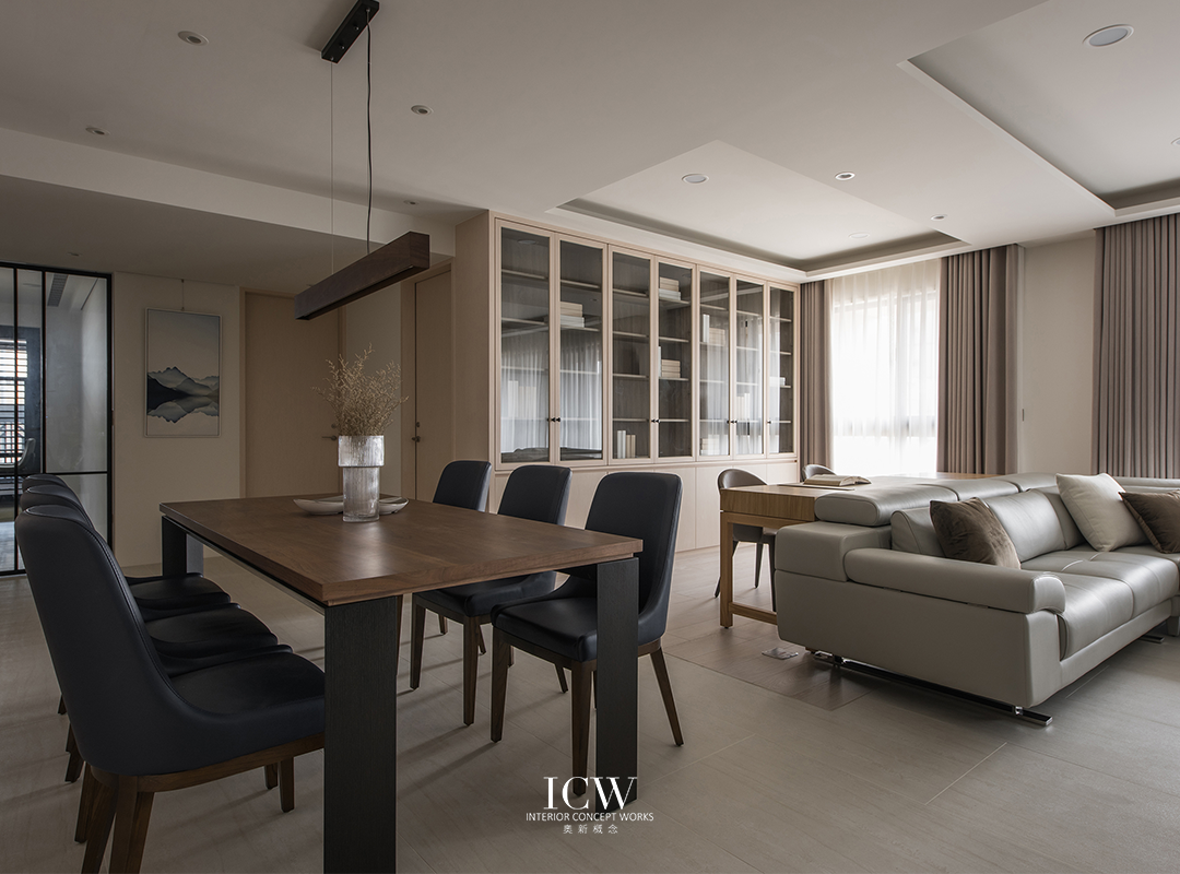 從公共區域的大型米色瓷磚連接到臥室的溫暖木地板,為不同的功能區域創造了獨特的觸感和視覺效果。 餐飲區後方巧妙設計的木質展示櫃帶有隱藏門,展現了額外的儲存空間和通往浴室的隱蔽通道,優化空間而不犧牲風格。 一個大型的開放式木質書架為起居室作為重要連結,成為展示書籍和珍品的展示櫃,為空間注入濃厚的人文氛圍和個性化色彩。讓整個空間、添增了溫馨的居家氛圍。