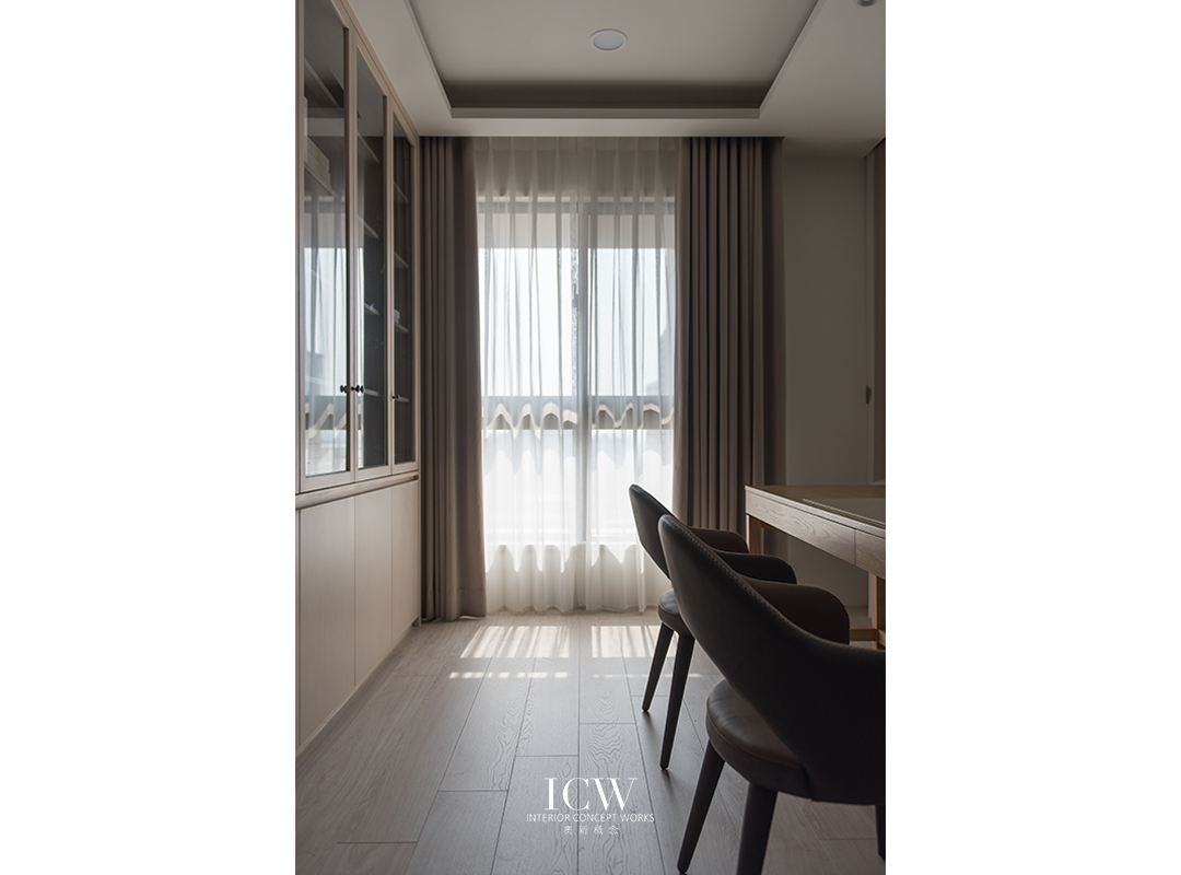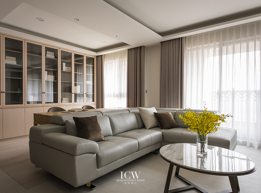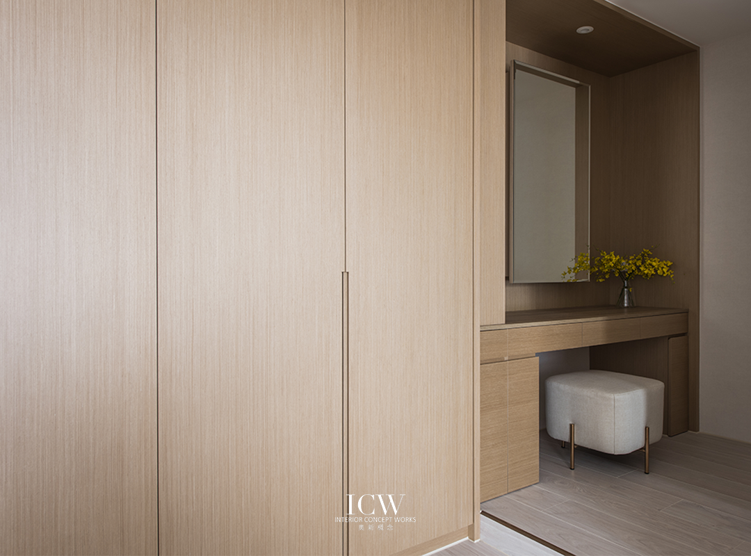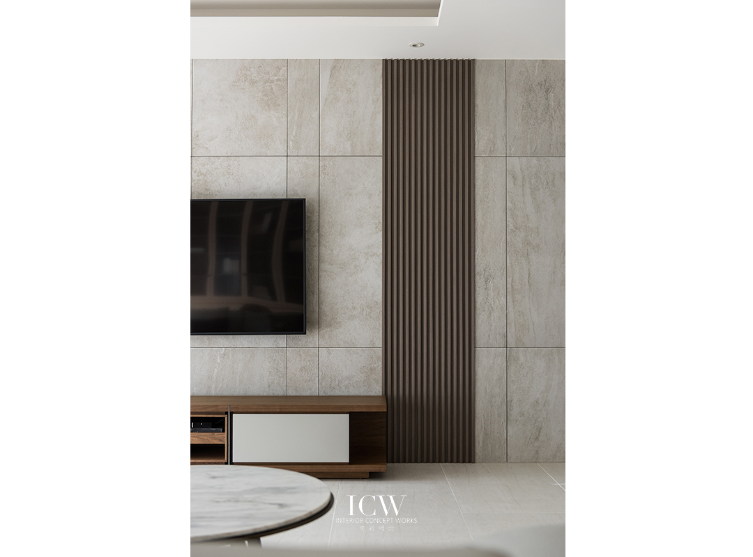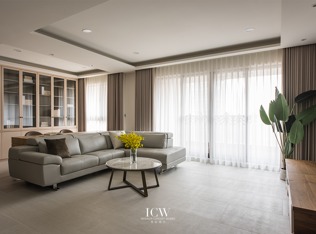 從公共區域的大型米色瓷磚連接到臥室的溫暖木地板,為不同的功能區域創造了獨特的觸感和視覺效果。 餐飲區後方巧妙設計的木質展示櫃帶有隱藏門,展現了額外的儲存空間和通往浴室的隱蔽通道,優化空間而不犧牲風格。 一個大型的開放式木質書架為起居室作為重要連結,成為展示書籍和珍品的展示櫃,為空間注入濃厚的人文氛圍和個性化色彩。讓整個空間、添增了溫馨的居家氛圍。