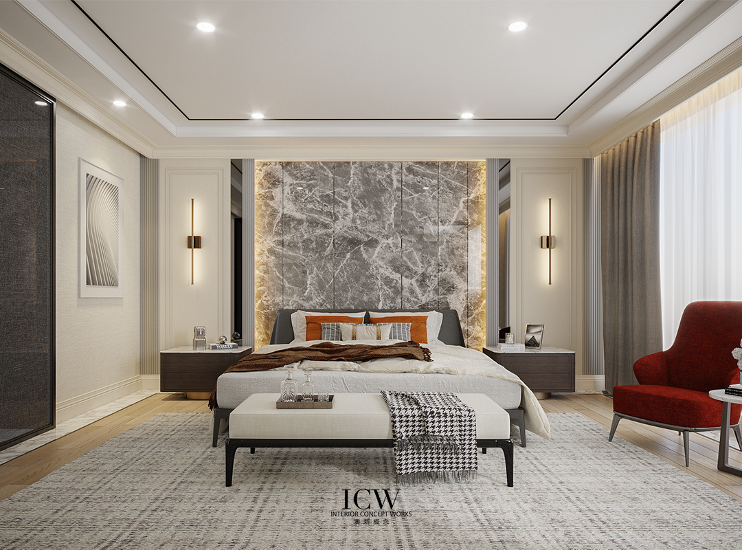 大坪數主臥室設計在選材上,是透過華麗大理石結合實木地板開始,提供優雅流暢的動線。門廳中宏偉樓梯設計成為現代空間的焦點,木質與金屬扶手的巧妙結合體現了奢華風格。大型開放式窗戶引入自然光,並框住泳池景觀。大坪數室內設計上的木質壁板平衡了大理石的冷硬感,為空間添加了溫暖。正式用餐區的客製化展示酒窖則是設計亮點,形成功能性的藝術牆。室外設計同樣考量,砂岩地板環繞泳池,與水面形成自然高度對比。整體設計透過材質搭配和空間規劃,完美塑造出精緻奢華的大坪數豪宅。