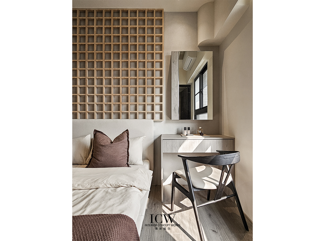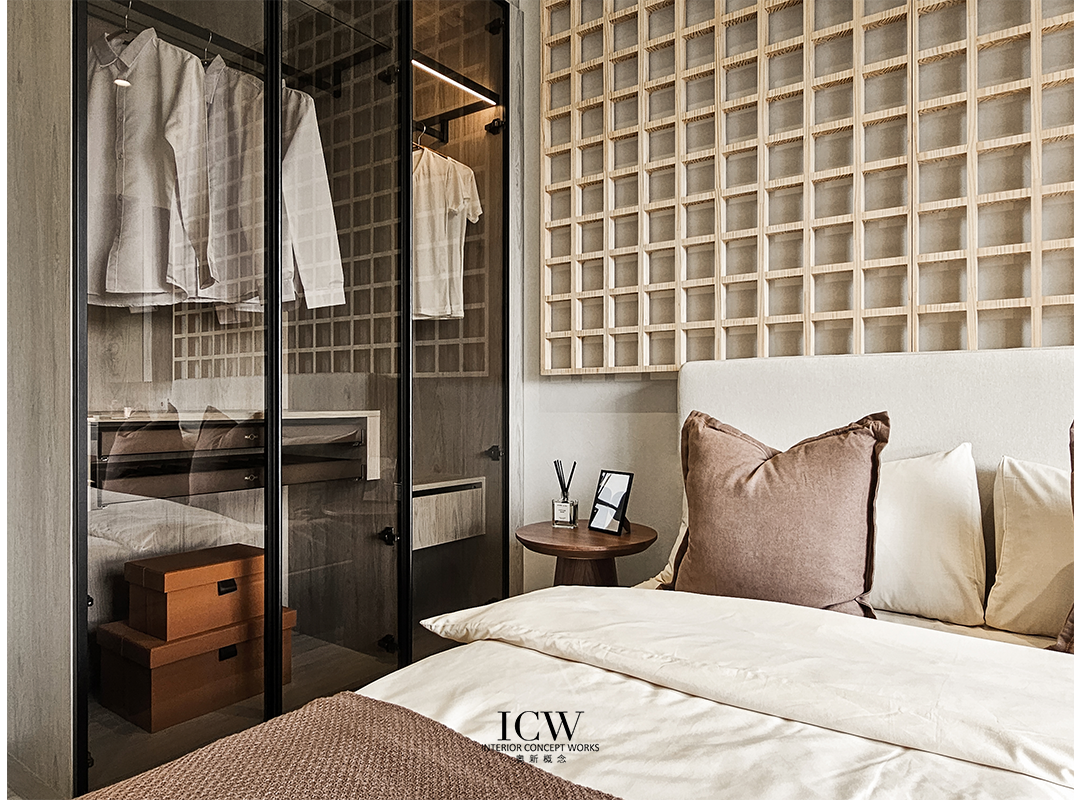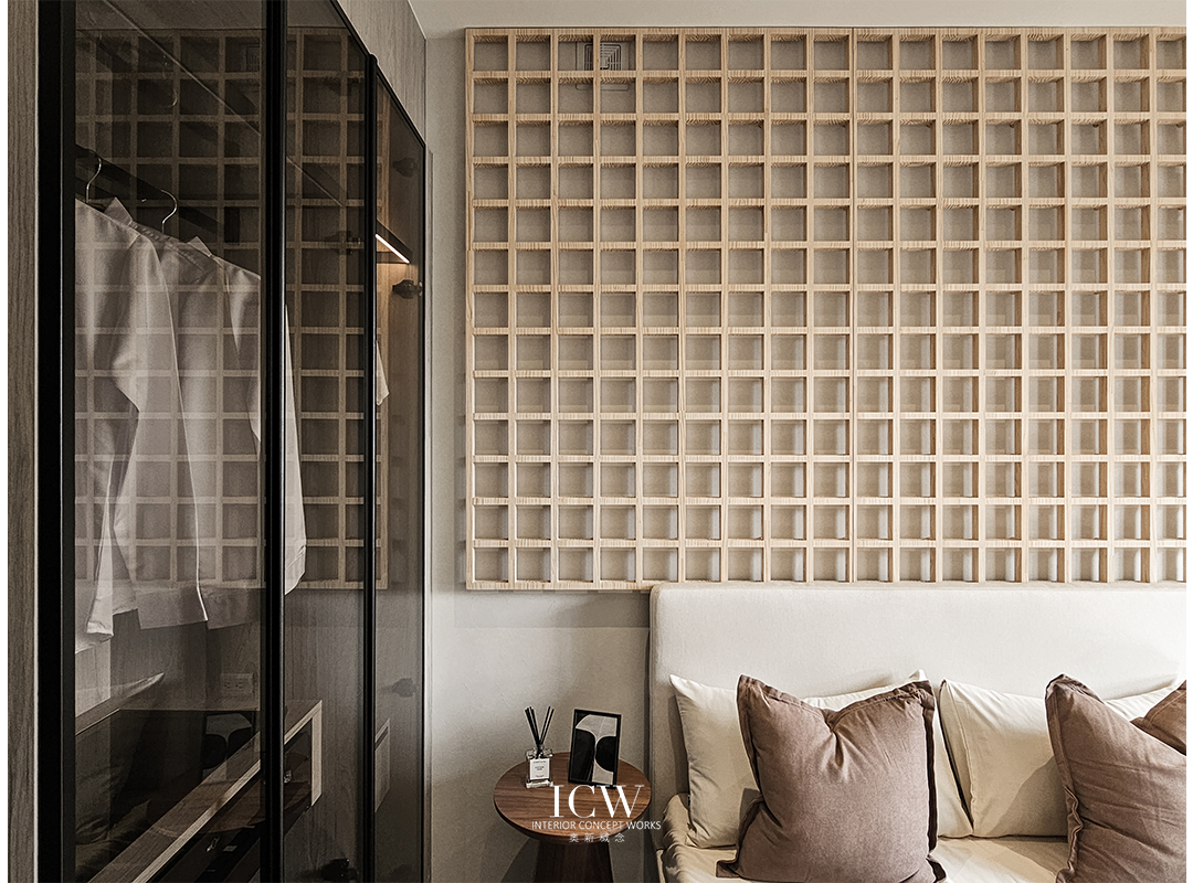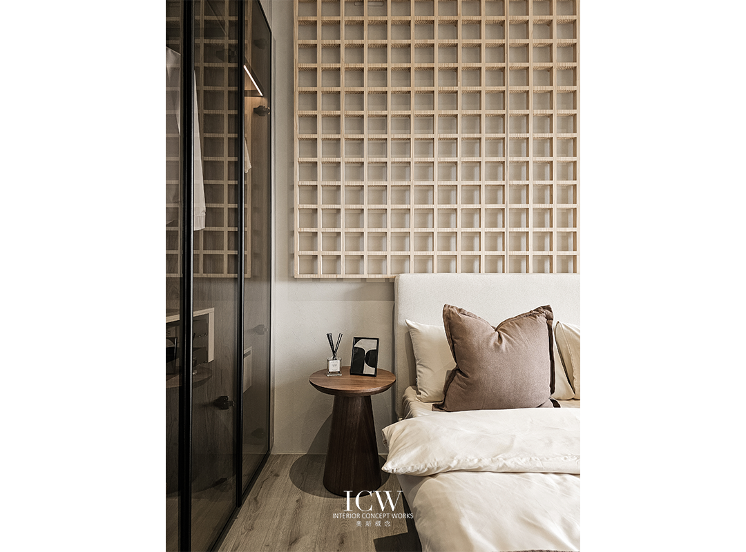 主臥室設計的焦點之一: 一面大型的木質簡約格柵屏風作為床頭板,不僅挑高創造視覺延伸,更增添了一份日式侘寂風設計的氣氛。