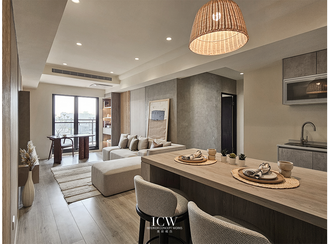 我們將具侘寂風元素自然融入至廚房寂吧檯: 木質紋理的吧檯桌面搭配藤編吊燈、餐墊及手拉坯杯巧妙且自然地融入室內。開放式廚房使用:淺米白色石材檯面及淺灰色櫃子讓整體的的色調維持在中性大地色系。