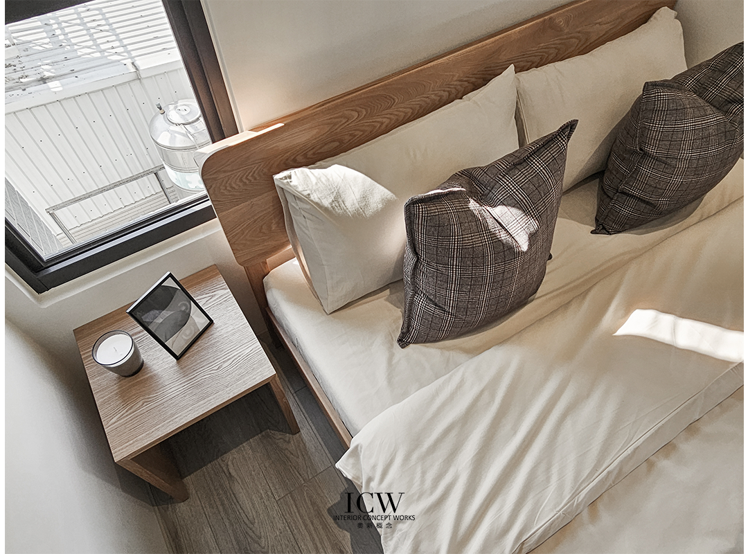 侘寂風格次臥室: 緊鄰公共浴室,自然紋理實木雙人床,與大地色調床品,讓整個侘寂風的設計從客廳持續的延伸。整個房子的室內設計巧妙地平衡了當代美學與生活機能,每一個細節都體現了侘寂風室內設計的精髓。
