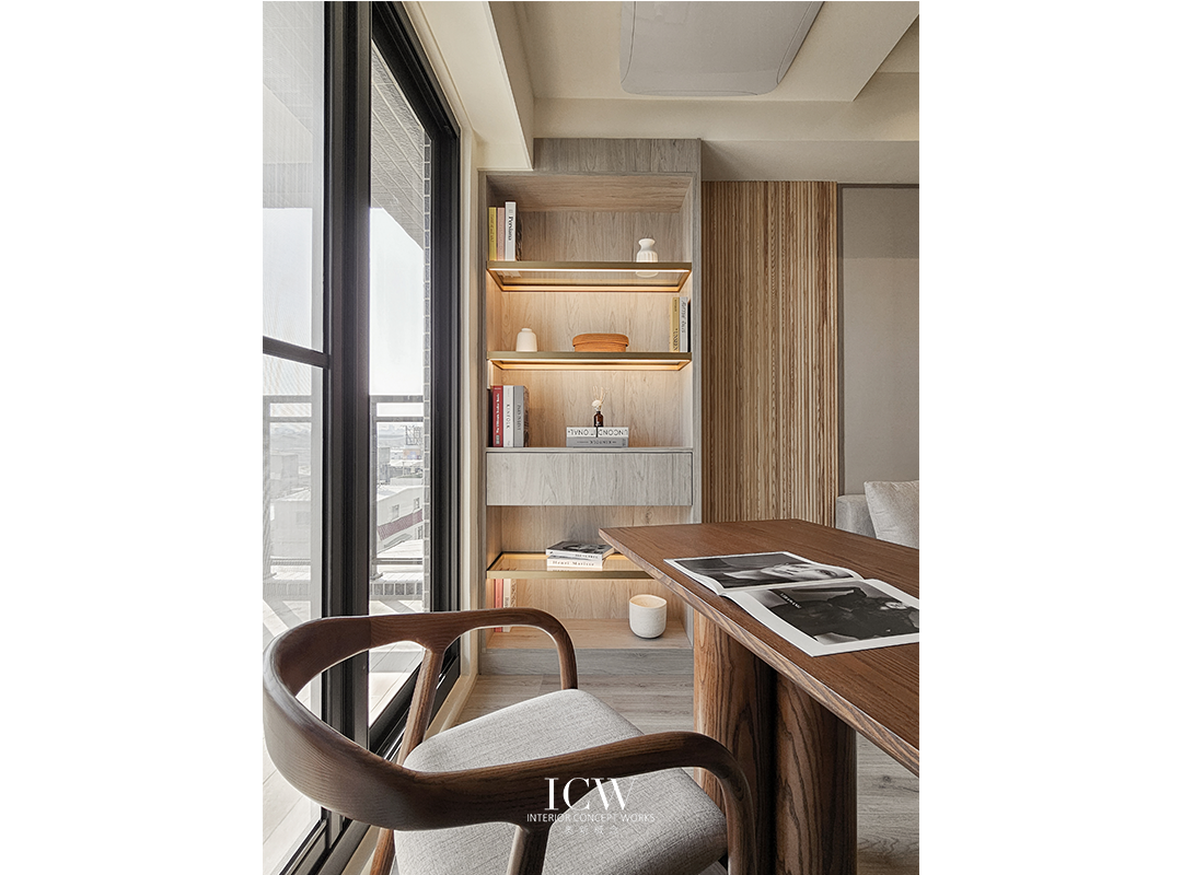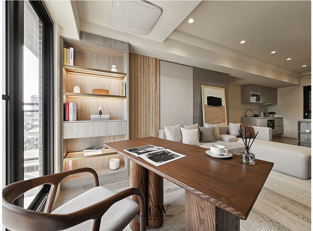 同時也滿足個人愛好,光線是屋主特別關注的元素,希望透過大片落地窗引入充足的自然光,創造一個適合閱讀的明亮空間,將侘寂風客廳中特別設置一張木質書桌、與展示書櫃,滿足屋主喜歡看書的愛好。我們將打造一個不僅能展現生活品質,更能滿足屋主對閱讀與烹飪的理想空間。