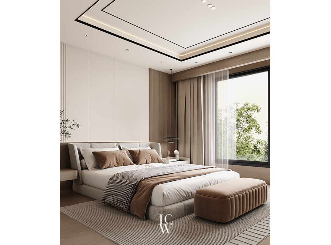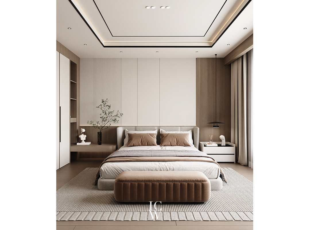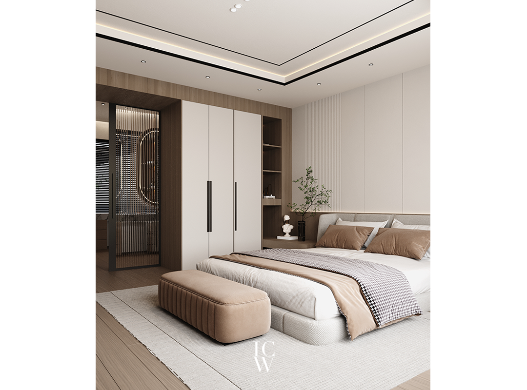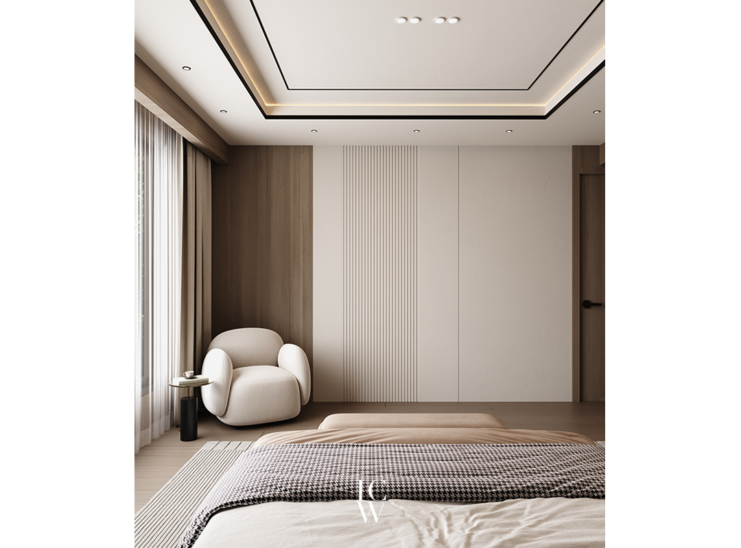 主臥空間以米白繃布與灰色調木質立面交織鋪陳,勾勒出對稱而安定的結構美學。低飽和色系的床品,營造出溫柔且沉靜的睡眠情境。
