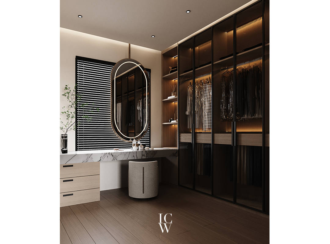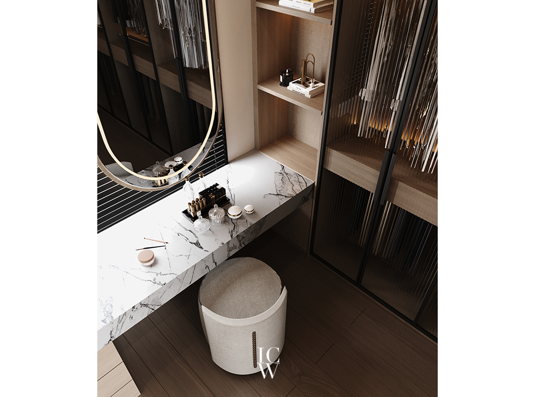 更衣室以玻璃拉門劃分,在保障私密性的同時,也蘊含視覺通透感。內部區分為日常穿搭與梳妝情境,木質層板結合霧黑金屬與白紋石材,勾勒出流暢且有序的動線美學。懸浮鏡面搭配柔和光源,彷彿暮光輕灑,讓每一次的梳妝都充滿靜謐與優雅。