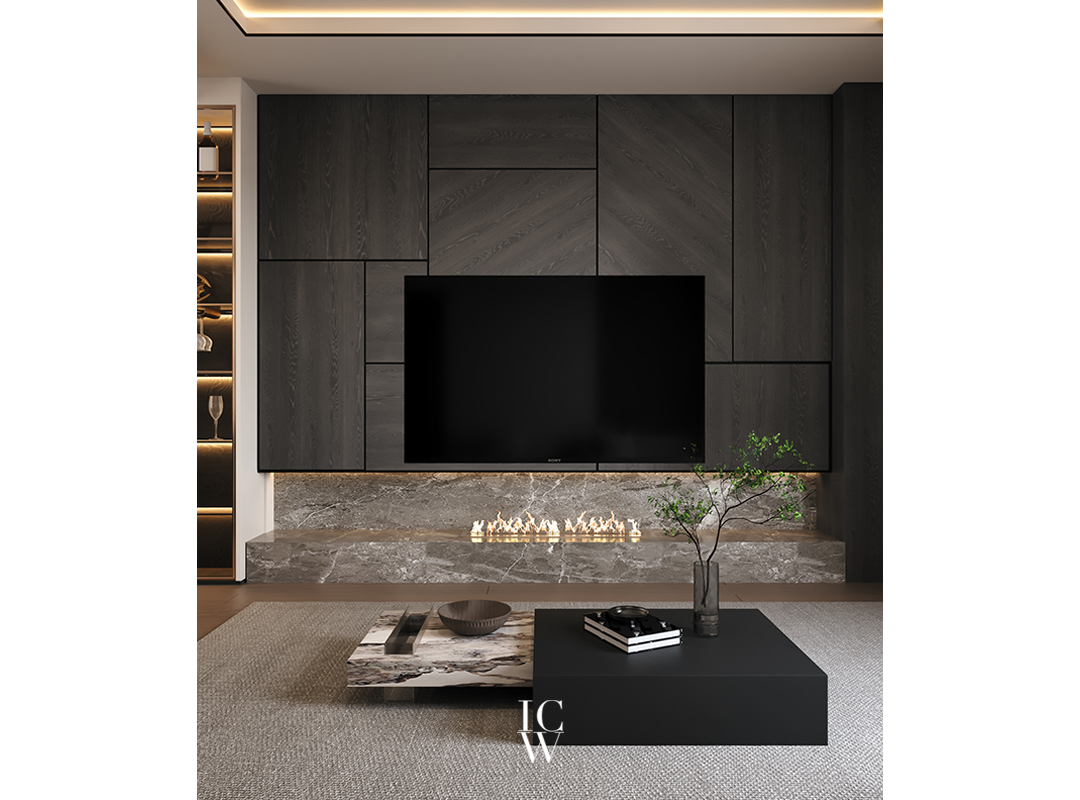 客廳電視牆的灰色石材,搭配木作格柵和Minotti沙發,再以電子壁爐的溫暖光影點綴,呈現低調而大器的奢華感。