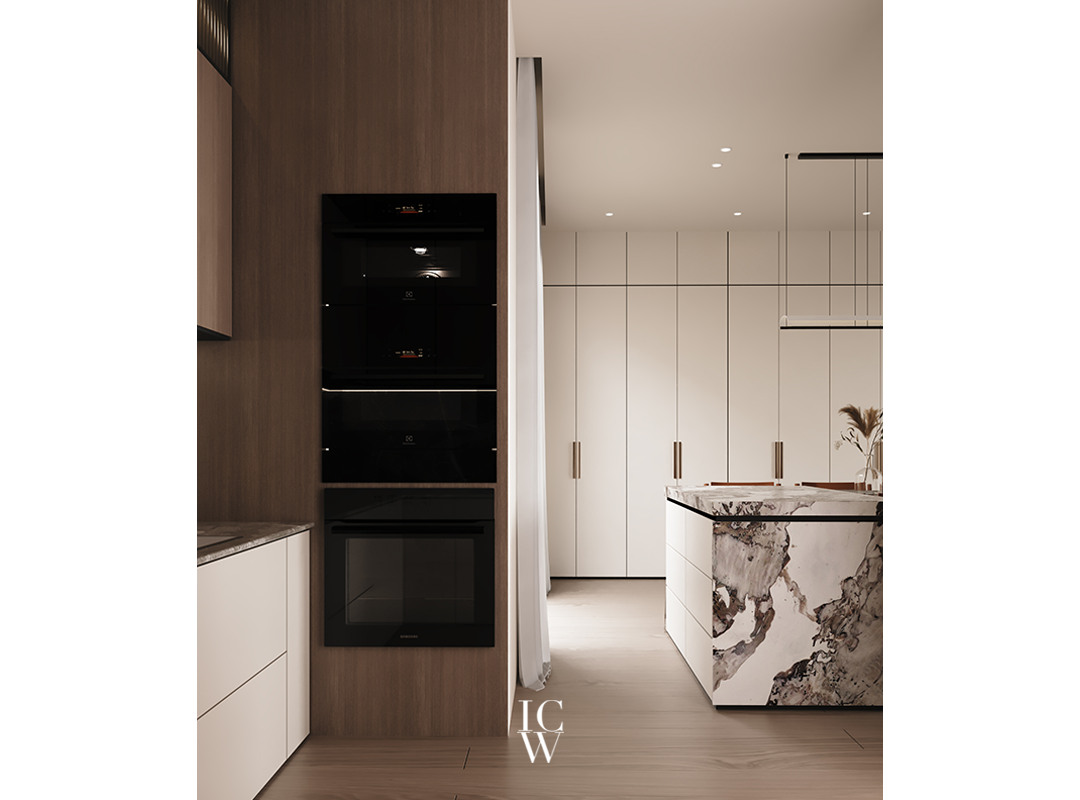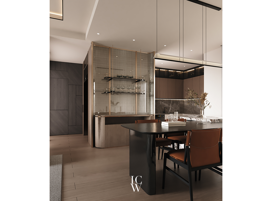 餐廚區跳脫傳統配置,以中島為核心,將機能與美學整合於流暢動線中。桌腳的精緻設計,使日常餐敘充滿儀式感;一體成型的Mini吧檯與餐桌,強化整體空間動線與視覺的線條流暢感,讓料理、上菜與用餐一氣呵成,兼具便利性與美觀。弧形夾紗玻璃的餐邊櫃,搭配古銅金屬的收邊細節,更添一絲精緻奢華,宛若飯店中的迷你吧,為居家生活增添優雅情調。