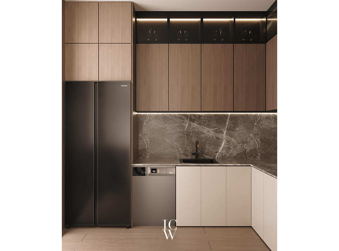 餐廚區以米色櫃體延伸視覺溫暖,流暢的線條與黑色石材餐桌形成質感對比;古銅金屬與玻璃展示櫃散發微光,塑造材質之間的協調與層次美。