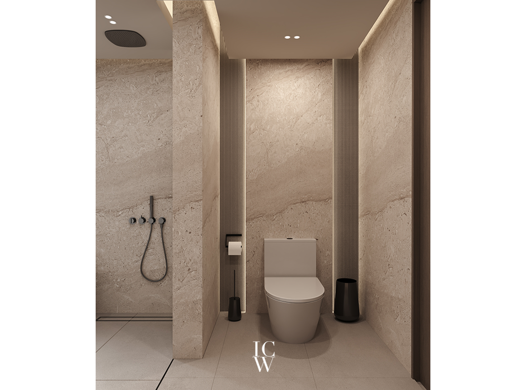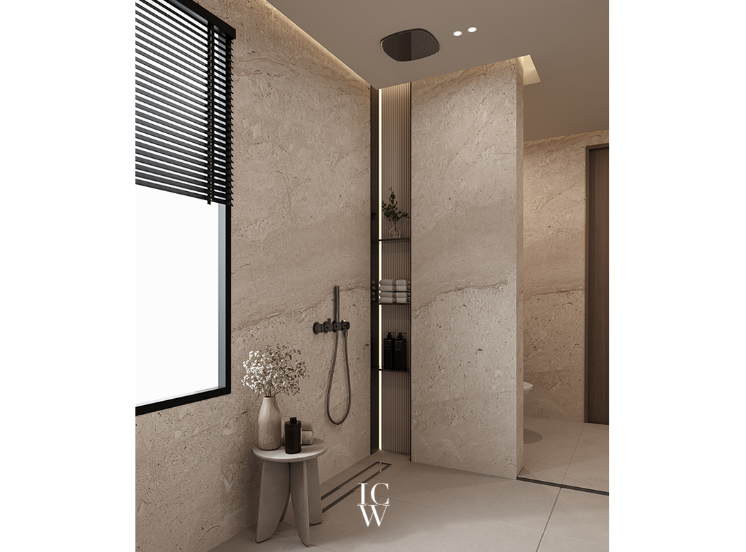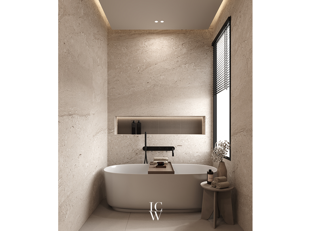 主浴空間延續臥室的溫潤氛圍,以霧米色洞石磁磚鋪陳沉穩基調,搭配獨立浴缸,營造極致放鬆感。
