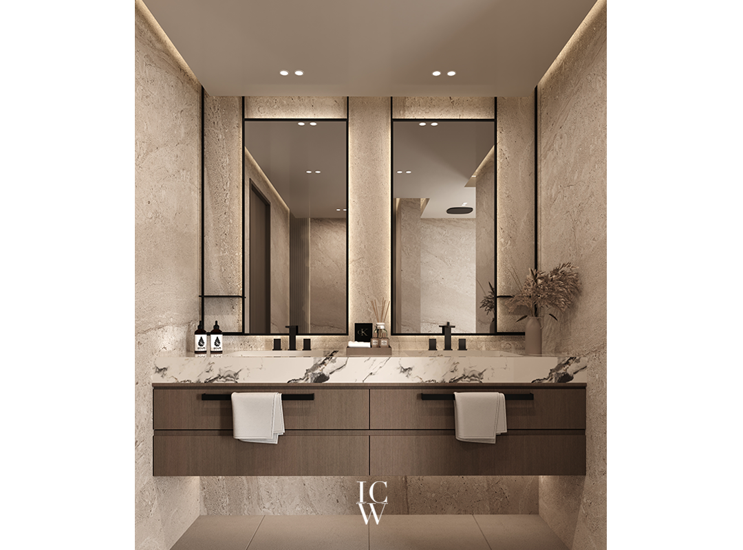 雙面盆洗手台採用錯落的黑白石材設計,既滿足同時使用的機能性,也呈現和諧的對稱美感。背光鏡面與長條設計帶出空間的光感層次,讓日常保養儀式,宛如專屬的SPA體驗,使生活中的每一刻都值得被珍視。