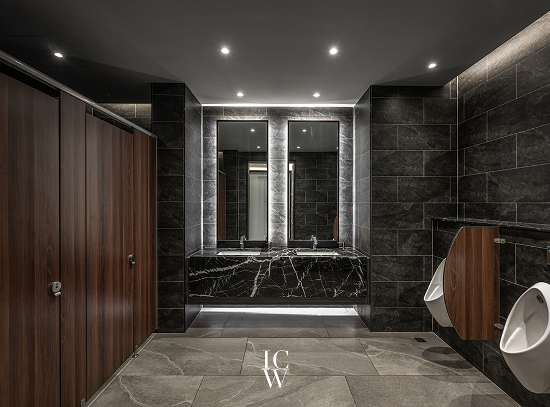 男賓室:黑色調石材與深湖桃色木皮門片,創造出英式的紳士格局也讓整體的空間氛圍沉靜與放鬆。