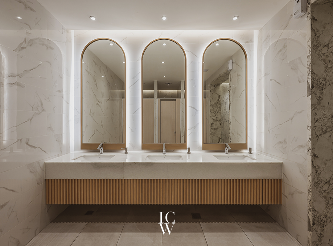 女賓室: 大面積卡拉拉白石材及霧金色框拱型挑高明鏡,拉高了視覺感受猶如飯店般的氣氛。